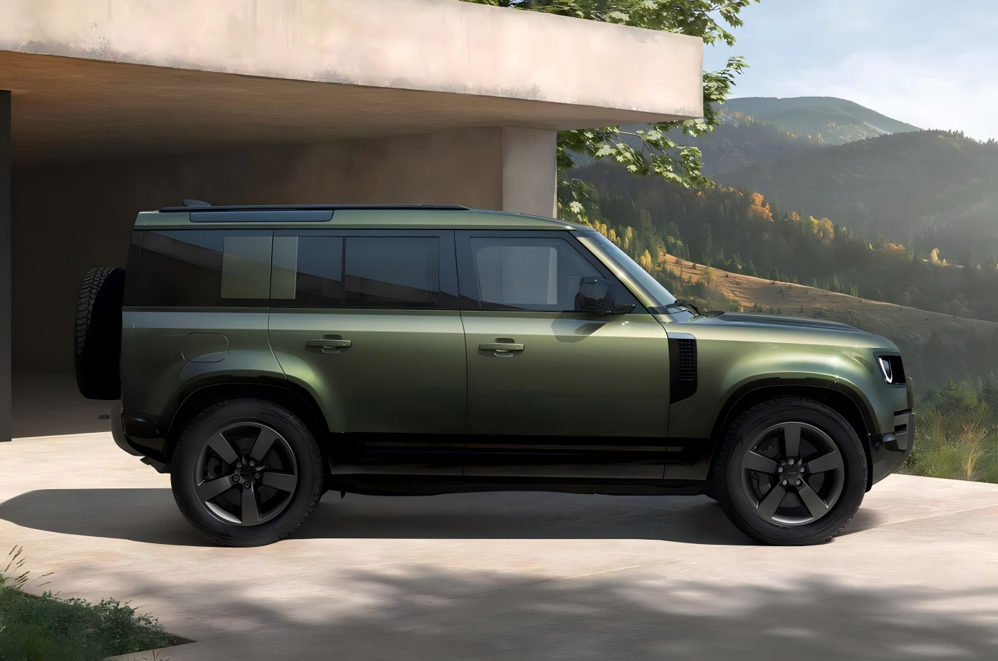 பக்க. பக்கத்திலிருந்து காண்க, புதிய வாகனம் லேண்ட் ரோவர் டிஃபென்டரின் உன்னதமான ஸ்டைலிங்கைத் தொடர்கிறது. 110 பதிப்பு நான்கு-கதவு வடிவமைப்பை ஏற்றுக்கொள்கிறது, இதில் பரந்த முன் மற்றும் பின்புற பக்க ஃபெண்டர்கள் இடம்பெற்றுள்ளன, அதோடு ஐந்து பேசும் சக்கரங்கள் மற்றும் மல்டி-பிஸ்டன் பிரேக் காலிப்பர்கள் உள்ளன. உடல் பரிமாணங்கள் முறையே 5018/2105/1967 மிமீ நீளம், அகலம் மற்றும் உயரம் மற்றும் 3022 மிமீ வீல்பேஸுடன் மாறாமல் உள்ளன.